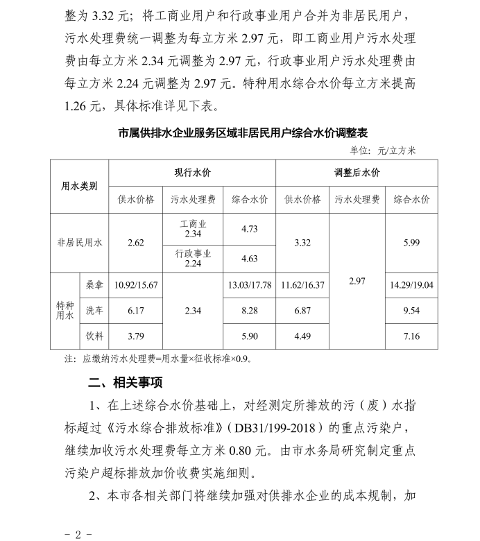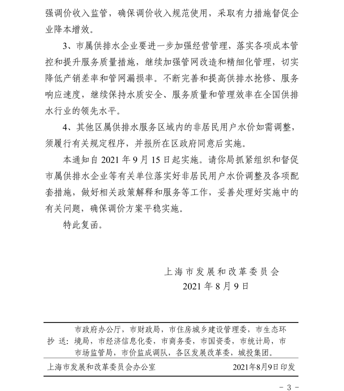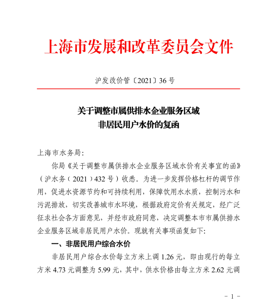 沪发改价管〔2021〕36号 《关于调整市属供排水企业服务区域非居民用户水价的复函》