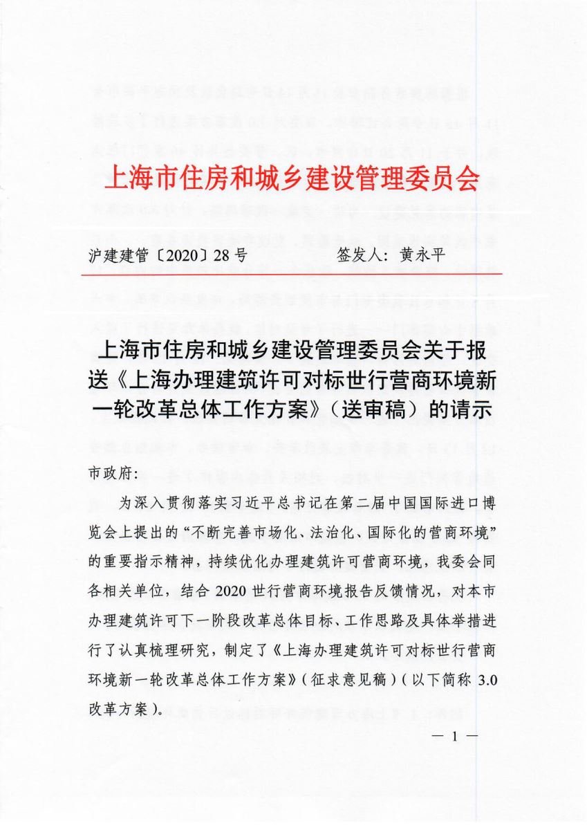 沪府办〔2020〕5号《上海市人民政府办公厅关于同意<上海办理建筑许可对标世界银行营商环境新一轮改革总体工作方案>的通知》